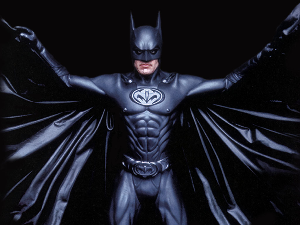 Description: A man dressed as batman standing in the dark with his arms outstretched and his hands out to the side.