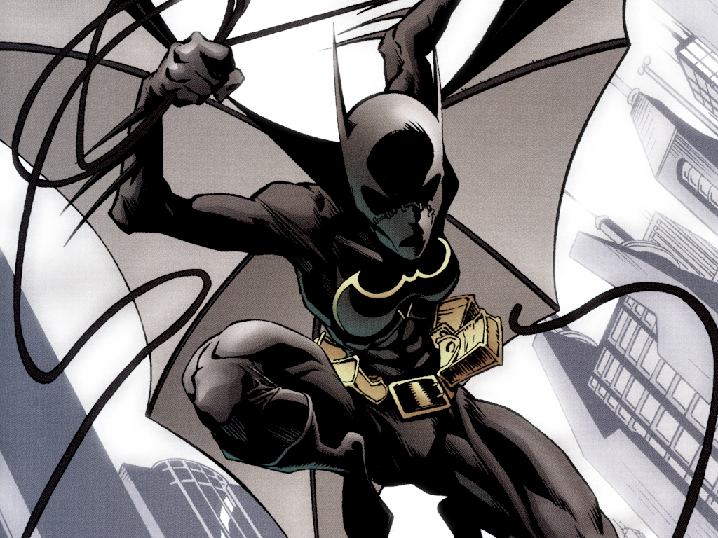 Description: A batman is flying through the air with his bat extended and his hands in his pockets.