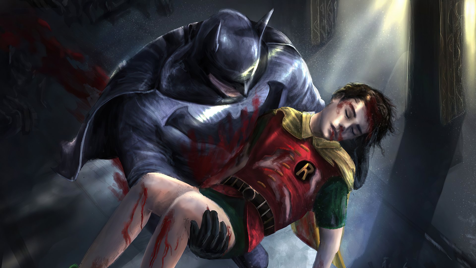 Description: A batman and a girl in a red shirt and green pants are fighting in a dark room with a light coming from behind.