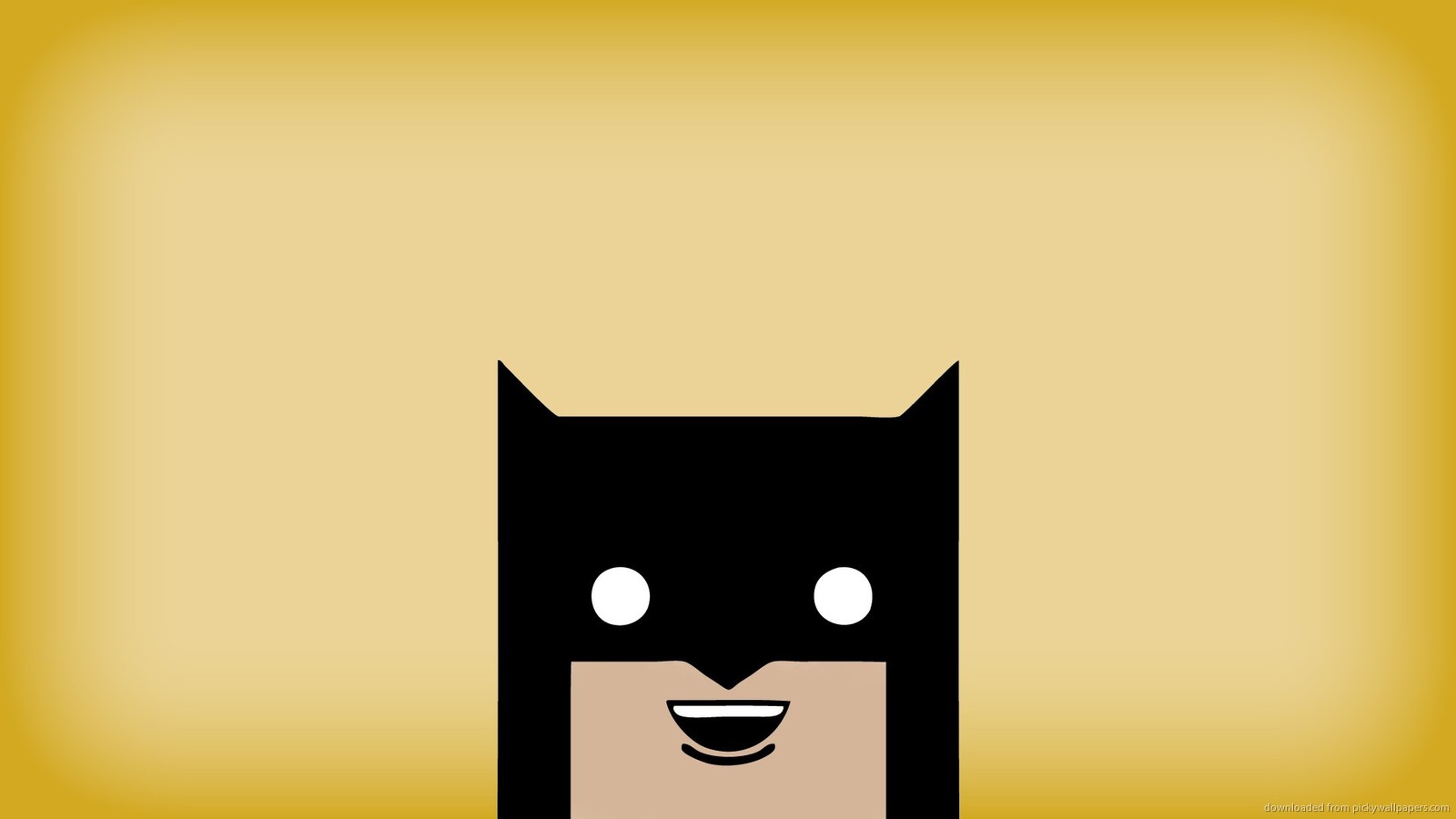 Description: A batman mask with a smile on it's face and a yellow background with a black outline on it.
