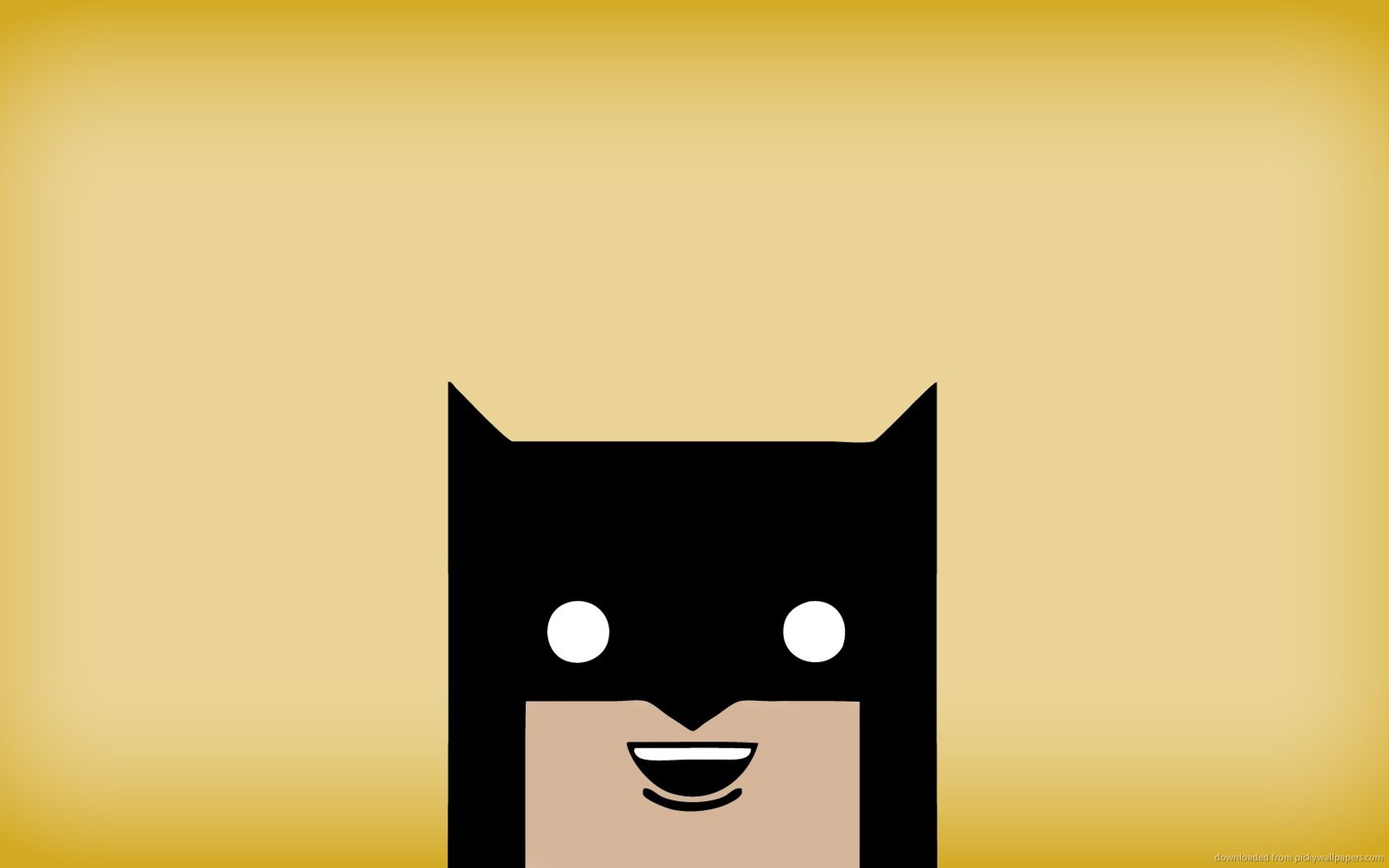 Description: A batman mask with a smile on it's face and a yellow background with a black outline and a yellow rectangle.