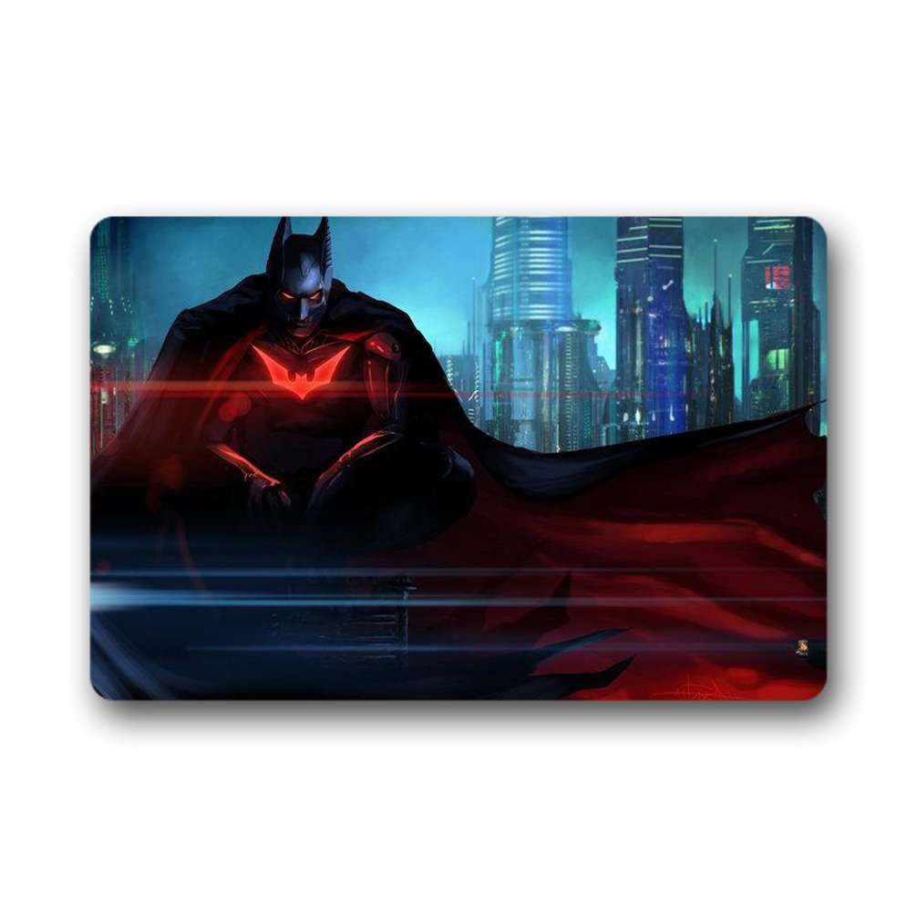 Description: A batman mouse pad with a red cape on it and a city in the background with skyscrapers in the background.