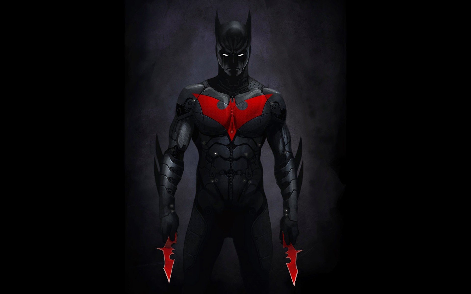Description: A batman character with red eyes and a black suit with red claws on his chest and chest.