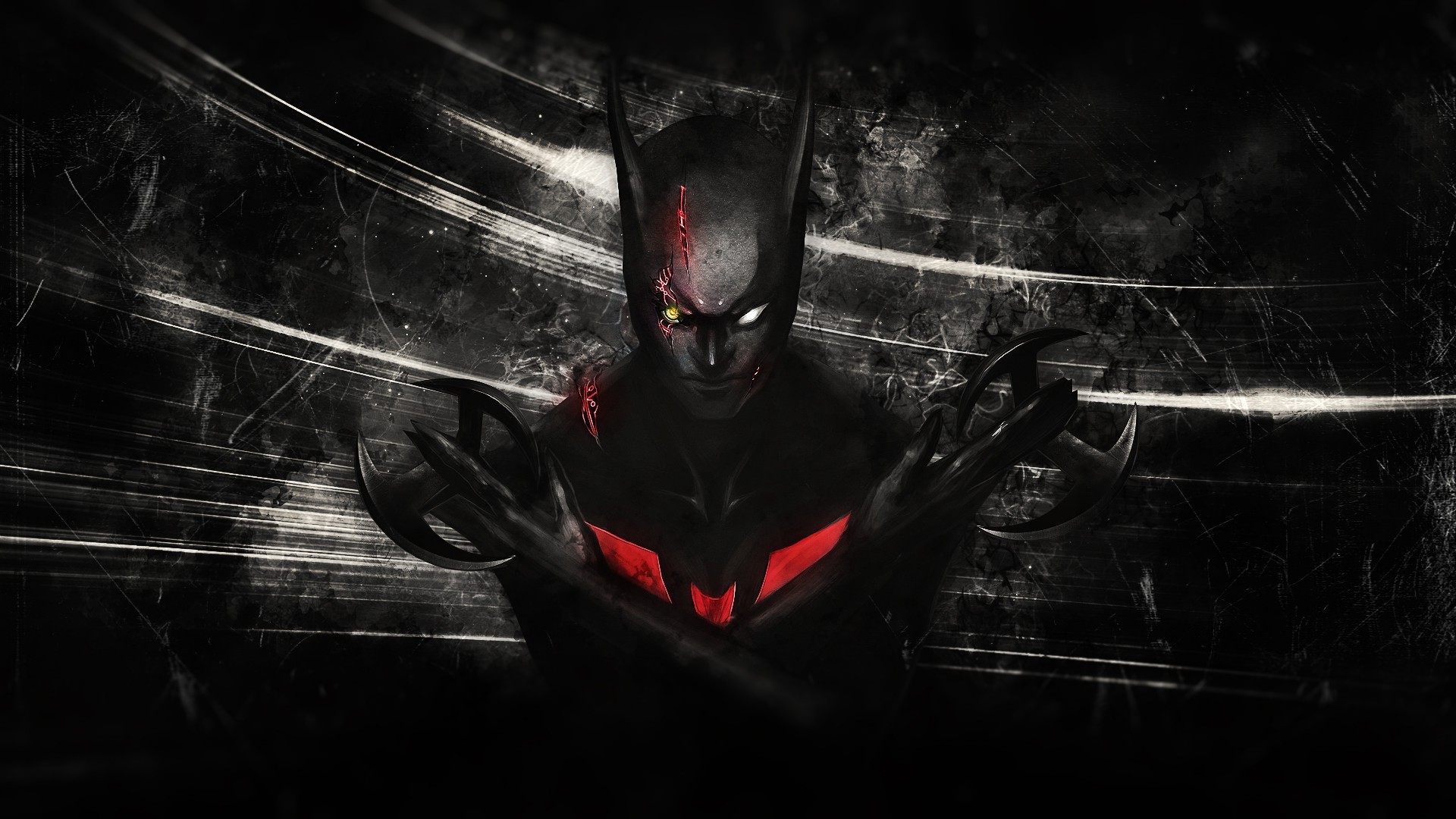 Description: A batman character with a red light on his face and a black background with white lines and a red light on his face.