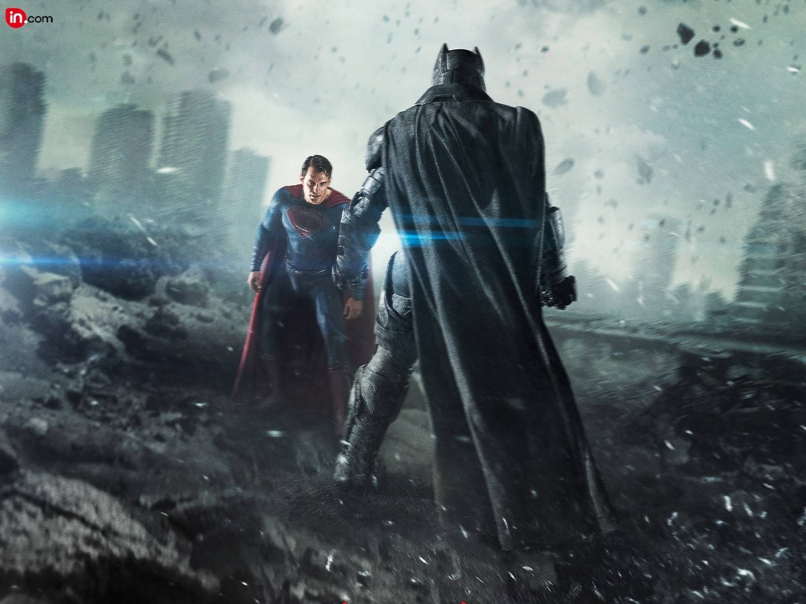 Description: A man and a woman in a batman movie scene with a city in the background and a sky with clouds.
