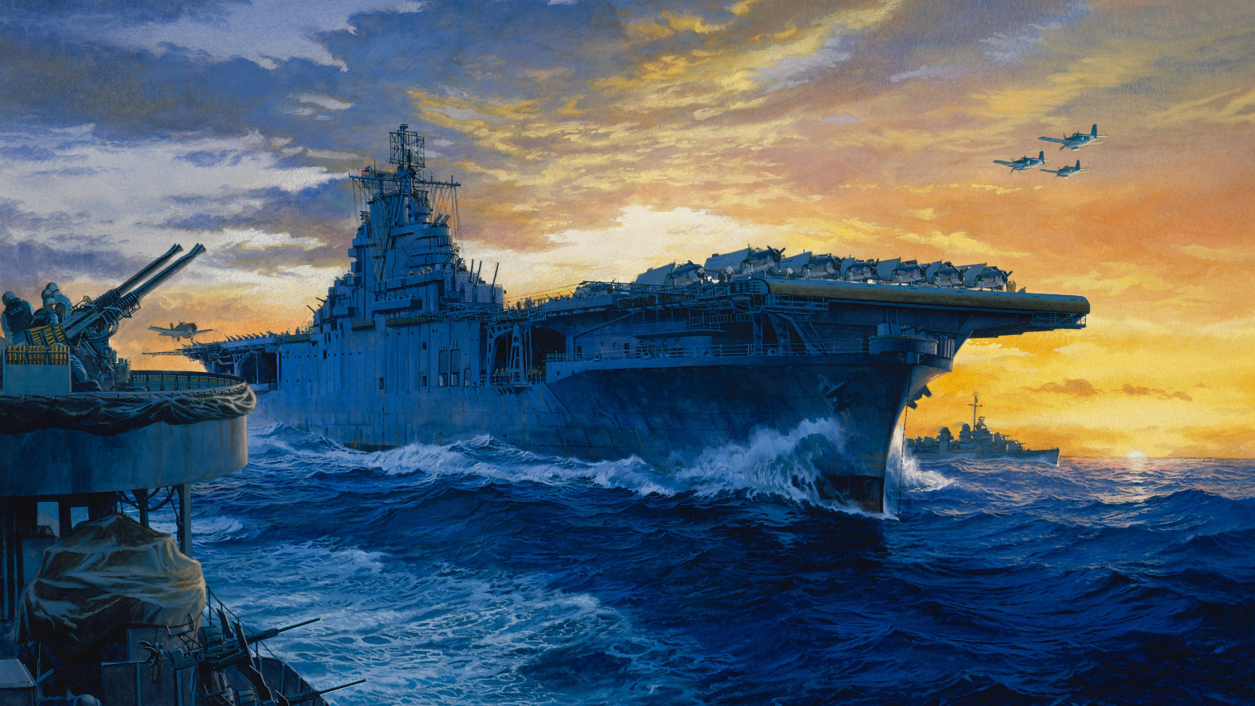 Description: A painting of a battleship in the ocean with a plane flying over it and a helicopter in the sky.