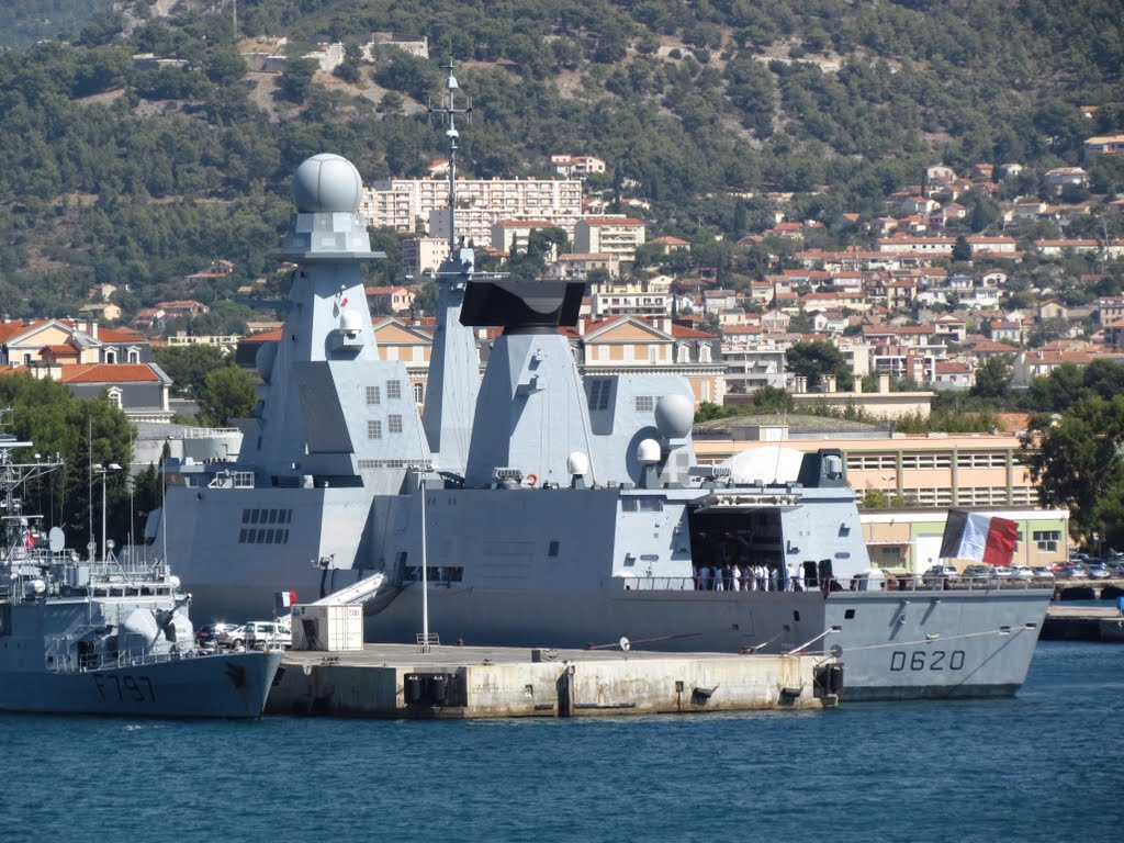 Description: A large battleship sitting in the water next to a city on a hill side with a town in the background.