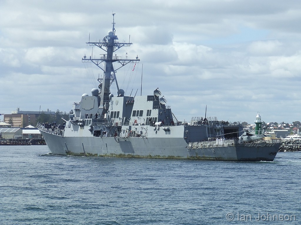 Description: A large battleship floating on top of a body of water next to a city skyline on a cloudy day.