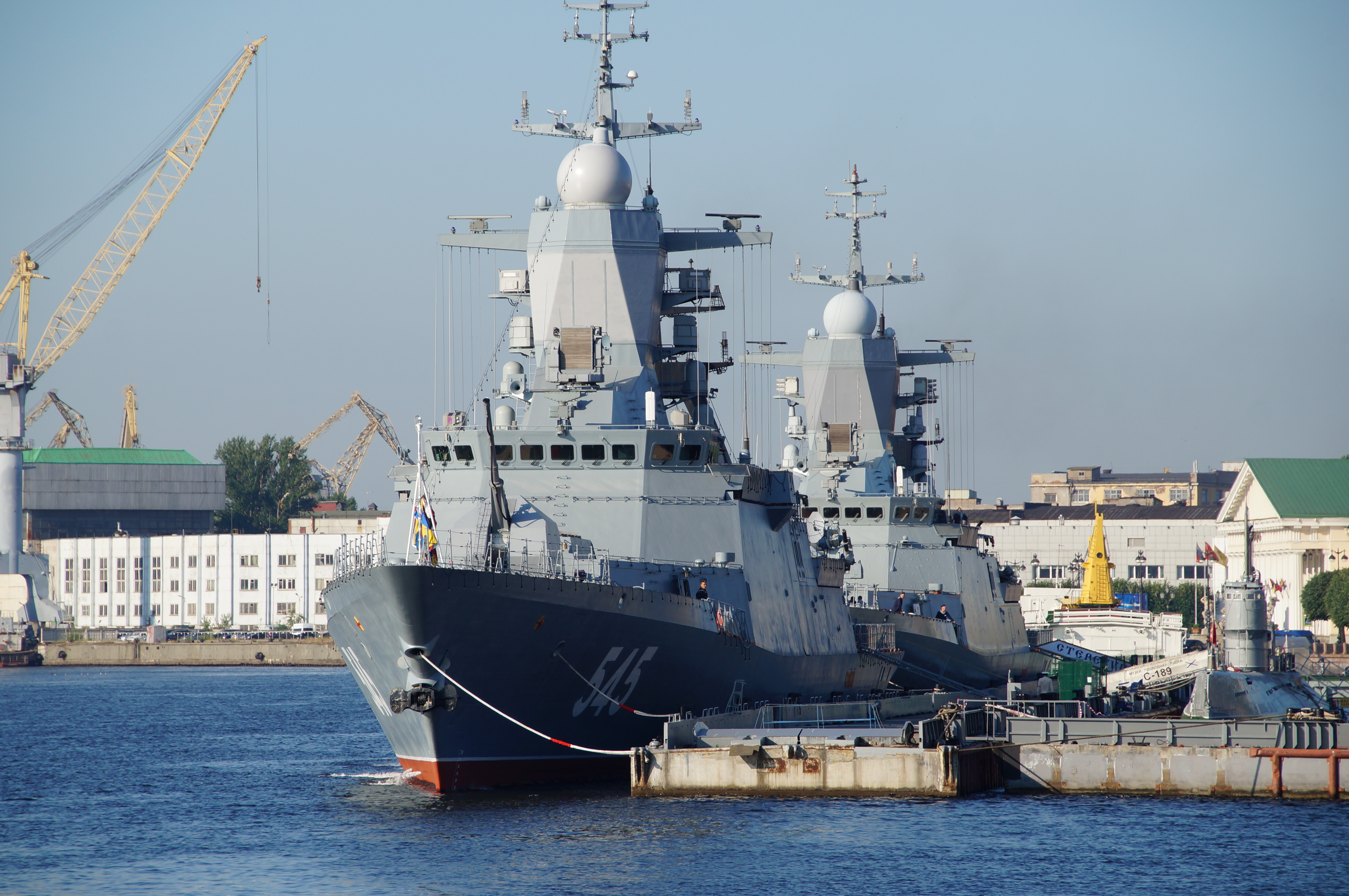 Description: A large battleship docked in a harbor with a crane in the background and a building in the background with a crane on the side of it.