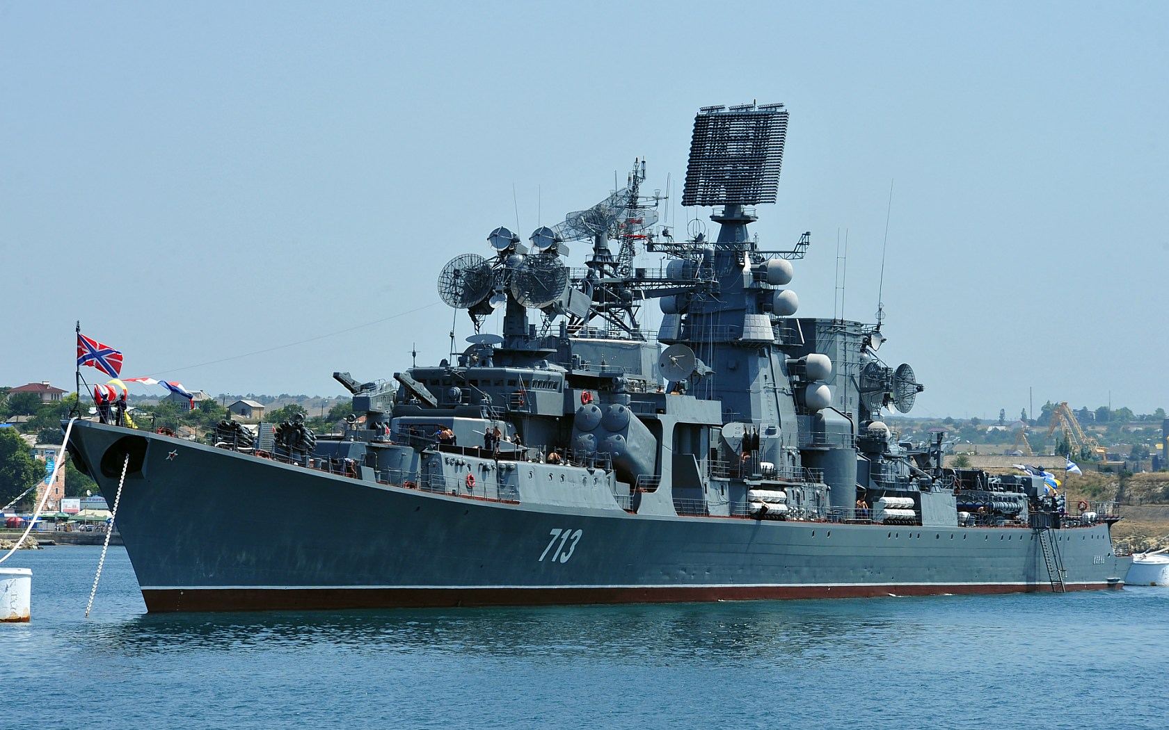 Description: A large battleship floating on top of a body of water next to a boat with a flag on it.
