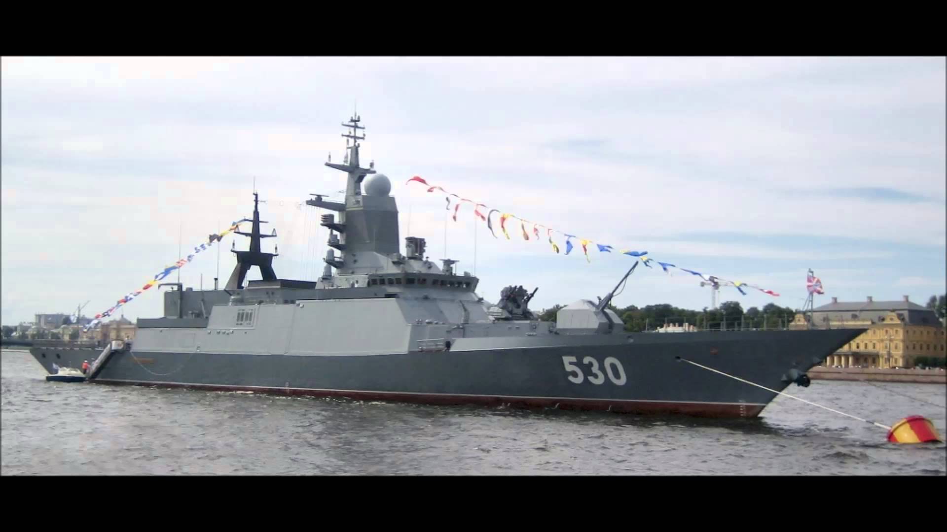 Description: A large battleship floating on top of a body of water next to a dock with flags flying from it.