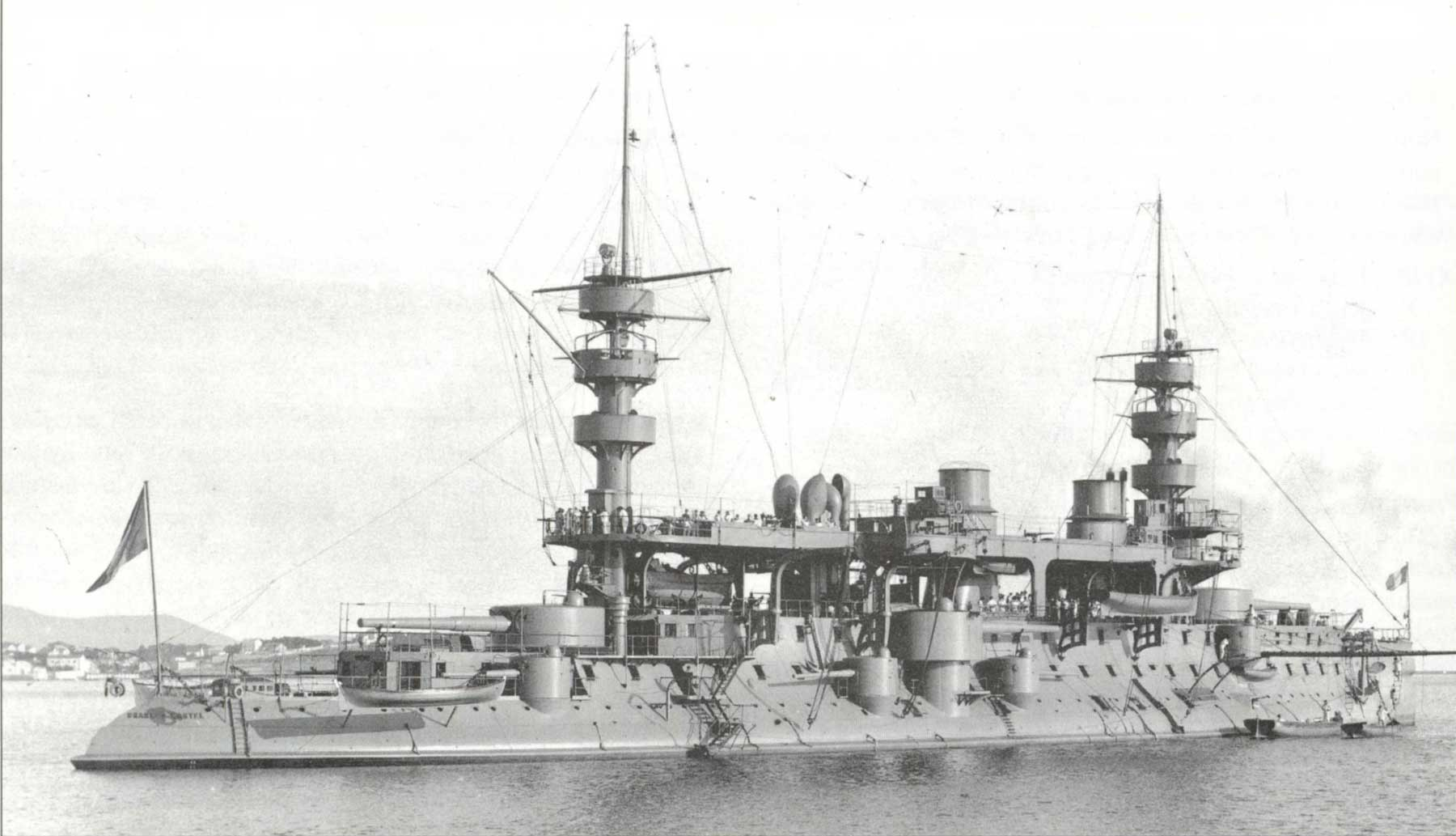 Description: A large battleship floating on top of a body of water next to a flag pole and a flag pole.