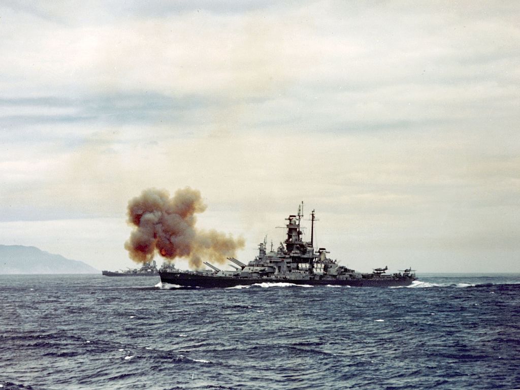 Description: A battleship is in the water with smoke coming out of it's stacks of smokes on the side.