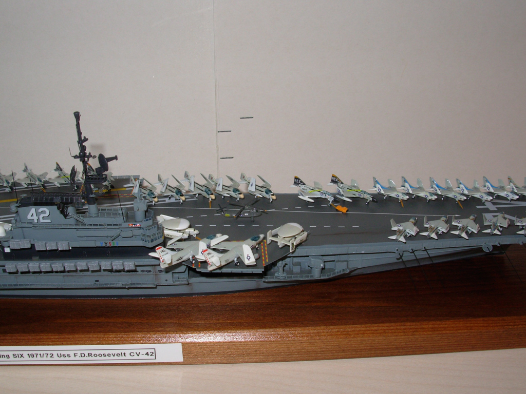 Description: A model of a battleship with a lot of fighter jets on it's hulls and a wooden stand.