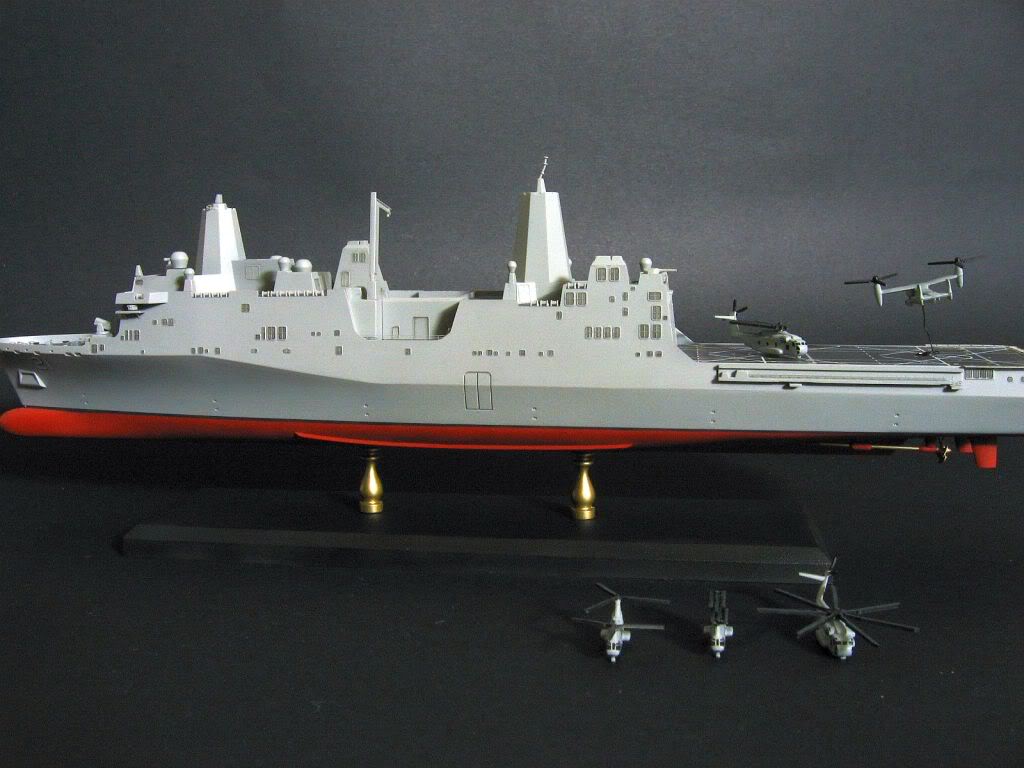 Description: A model of a battleship with a helicopter on the side of it and a black background with a white background.