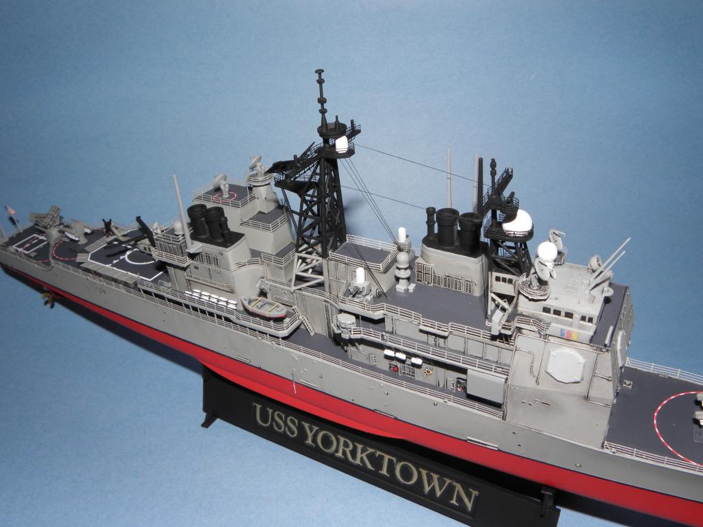 Description: A model of a battleship on a blue background with a us navy logo on it's side and a black and red stripe on the bottom.