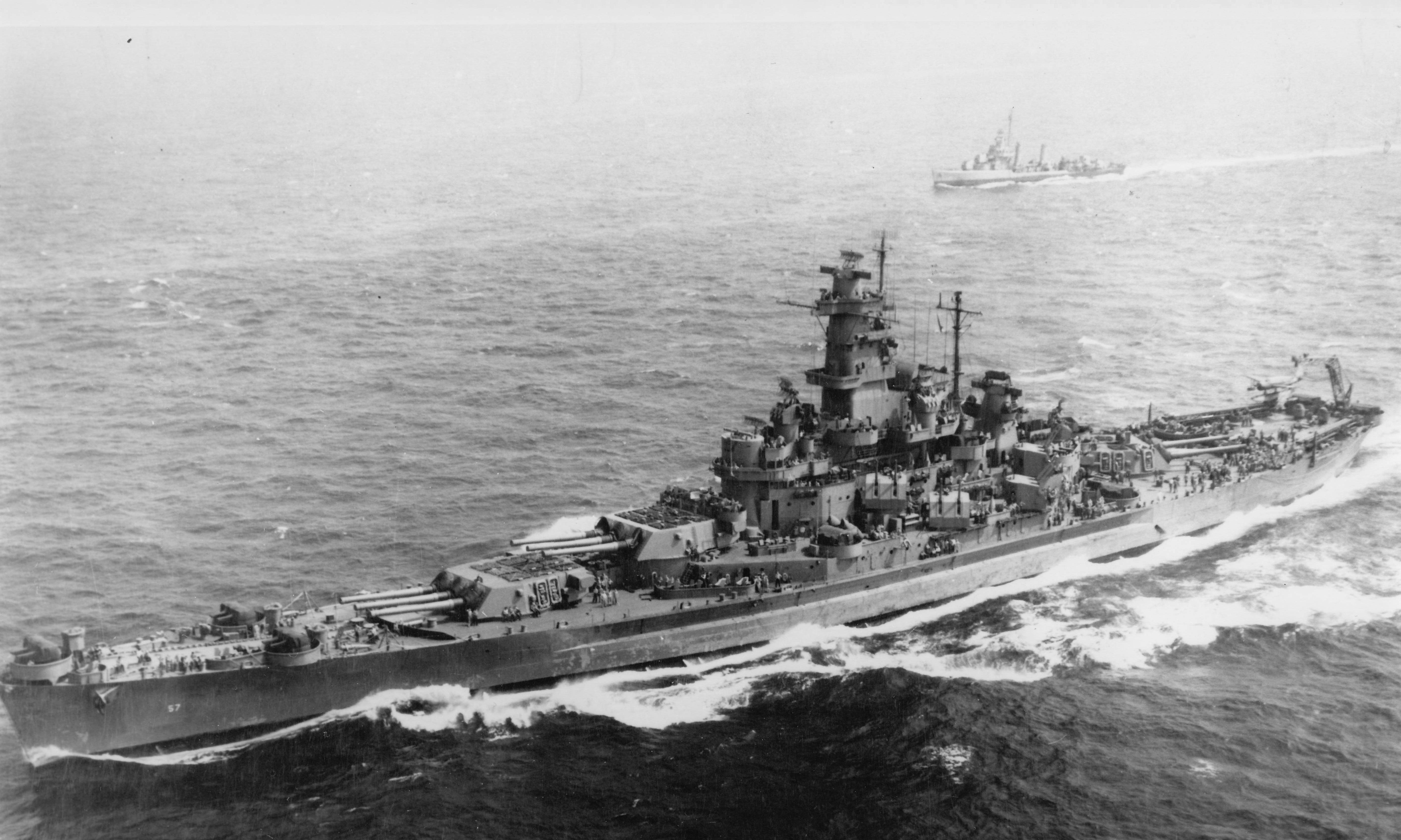 Description: A large battleship in the middle of the ocean with a boat in the background and a smaller boat in the water.