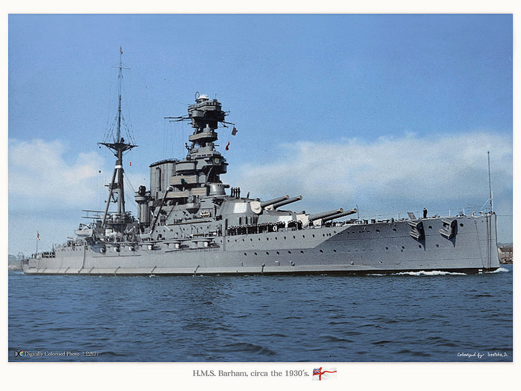 Description: A large battleship floating on top of a body of water next to a boat on the ocean with a sky background.