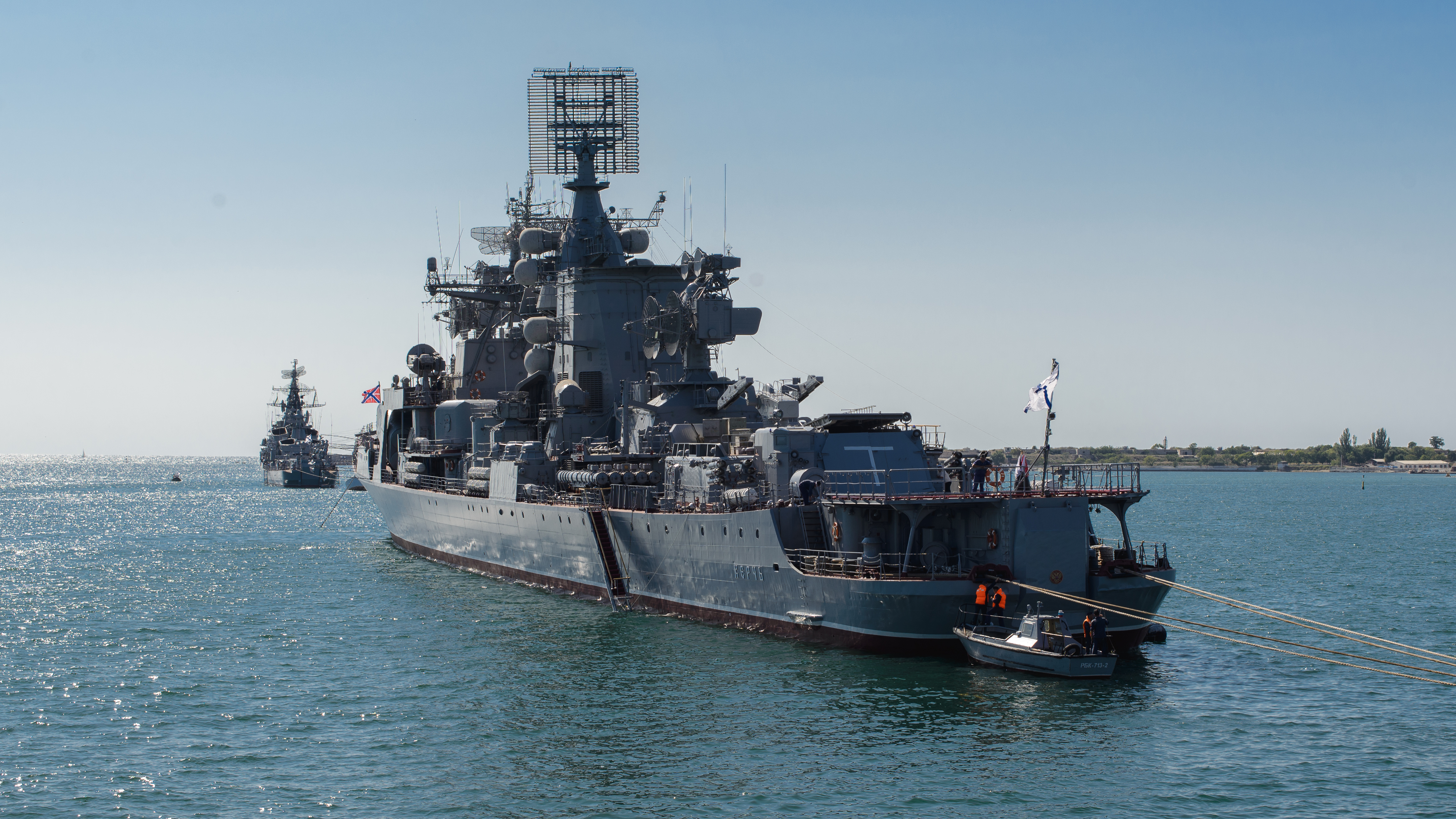 Description: A large battleship floating on top of a body of water next to a boat in the ocean with a tug.