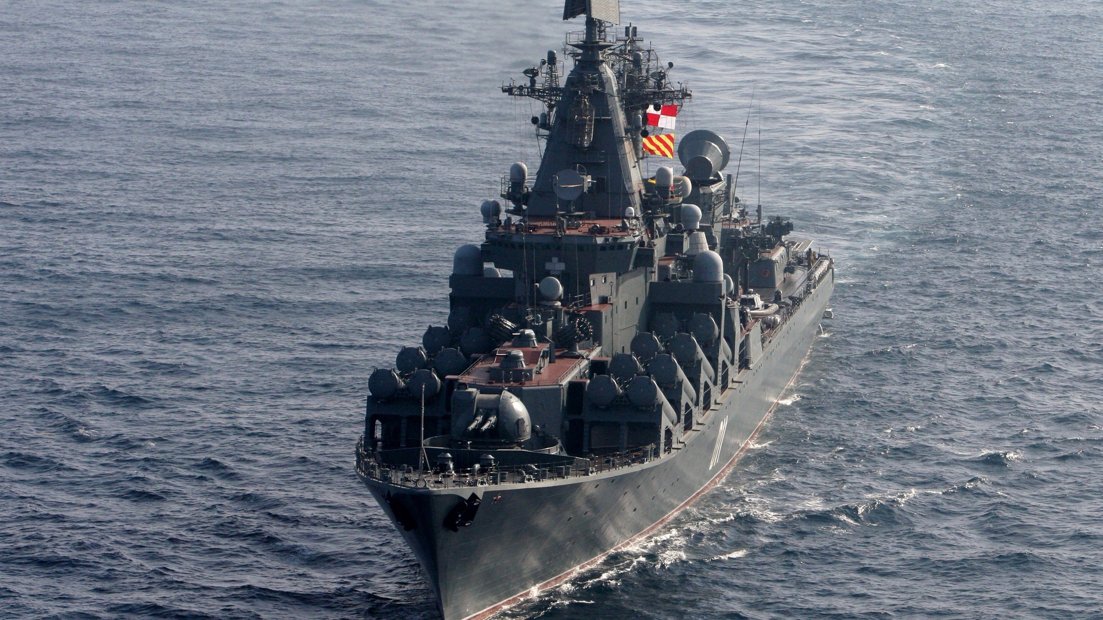 Description: A large battleship in the middle of the ocean with a flag on top of it and a smaller boat in the water.