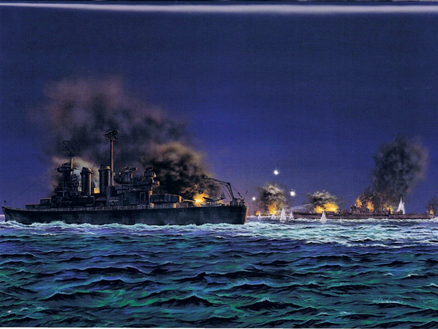Description: A painting of a battleship in the ocean with smoke billowing out of it's stacks and smoke billowing out from the stacks.