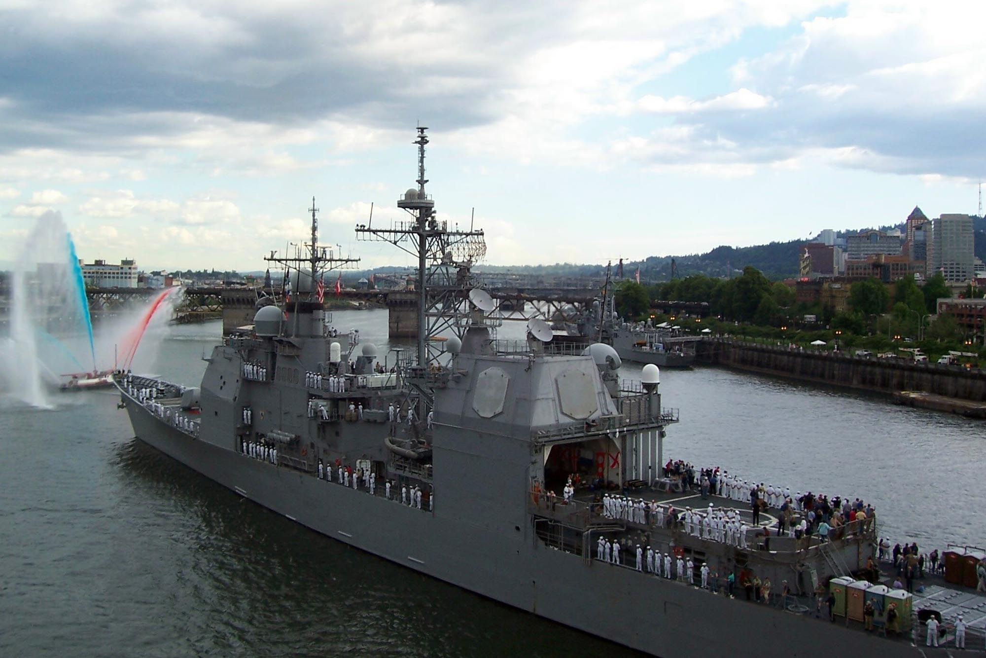 Description: A large battleship is in the water with a lot of people on it and a fountain in the background.