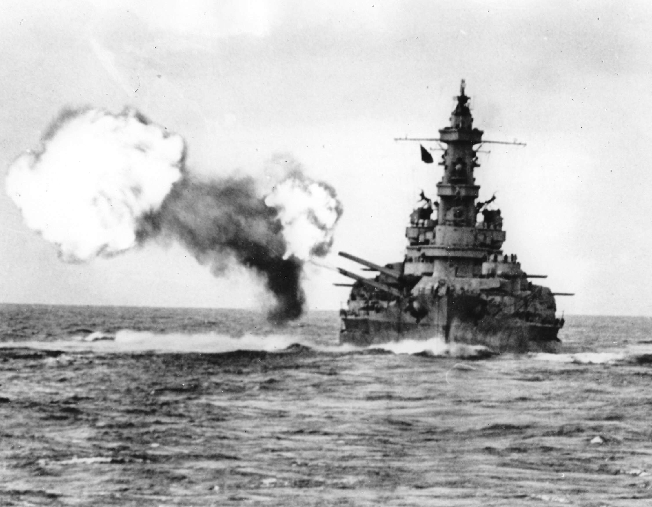 Description: A battleship with smoke coming out of it and a smaller ship in the background with smoke coming out of it.