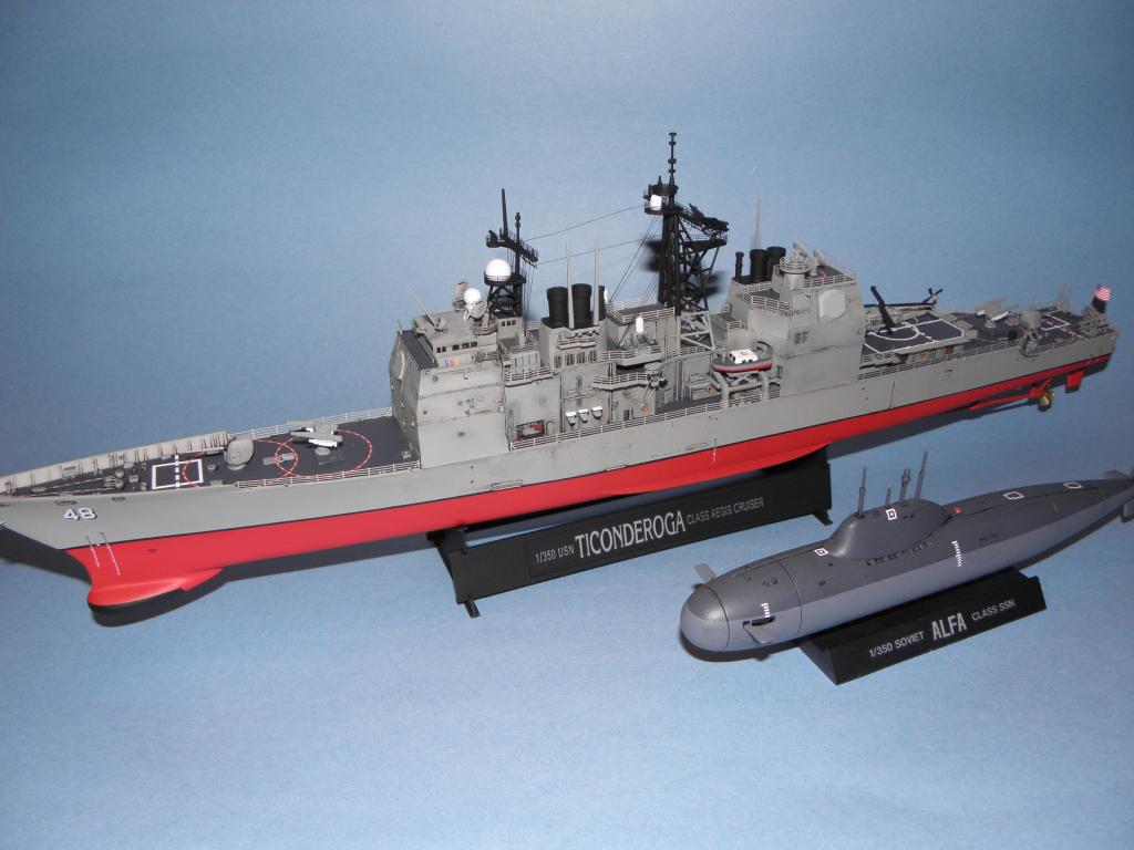 Description: A model of a battleship and a submarine on a blue background with a black submarine below it and a gray submarine below it.