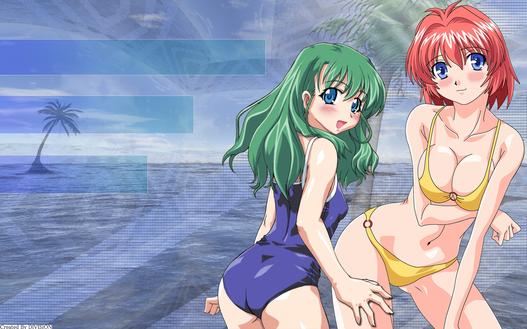 Description: Two anime girls in bathing suits standing next to each other on a beach with palm trees in the background.