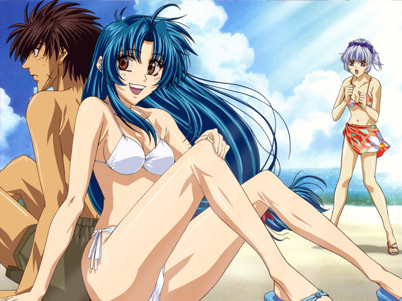 Description: A woman in a bikini sitting on the beach next to a man in a bathing suit and a man in a bathing suit.