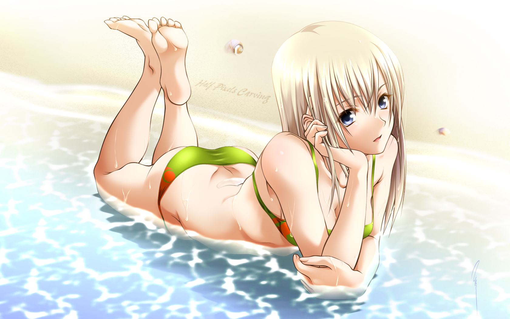Description: A woman in a bikini laying on the beach in the water with her feet up on the sand and her head in her hand.
