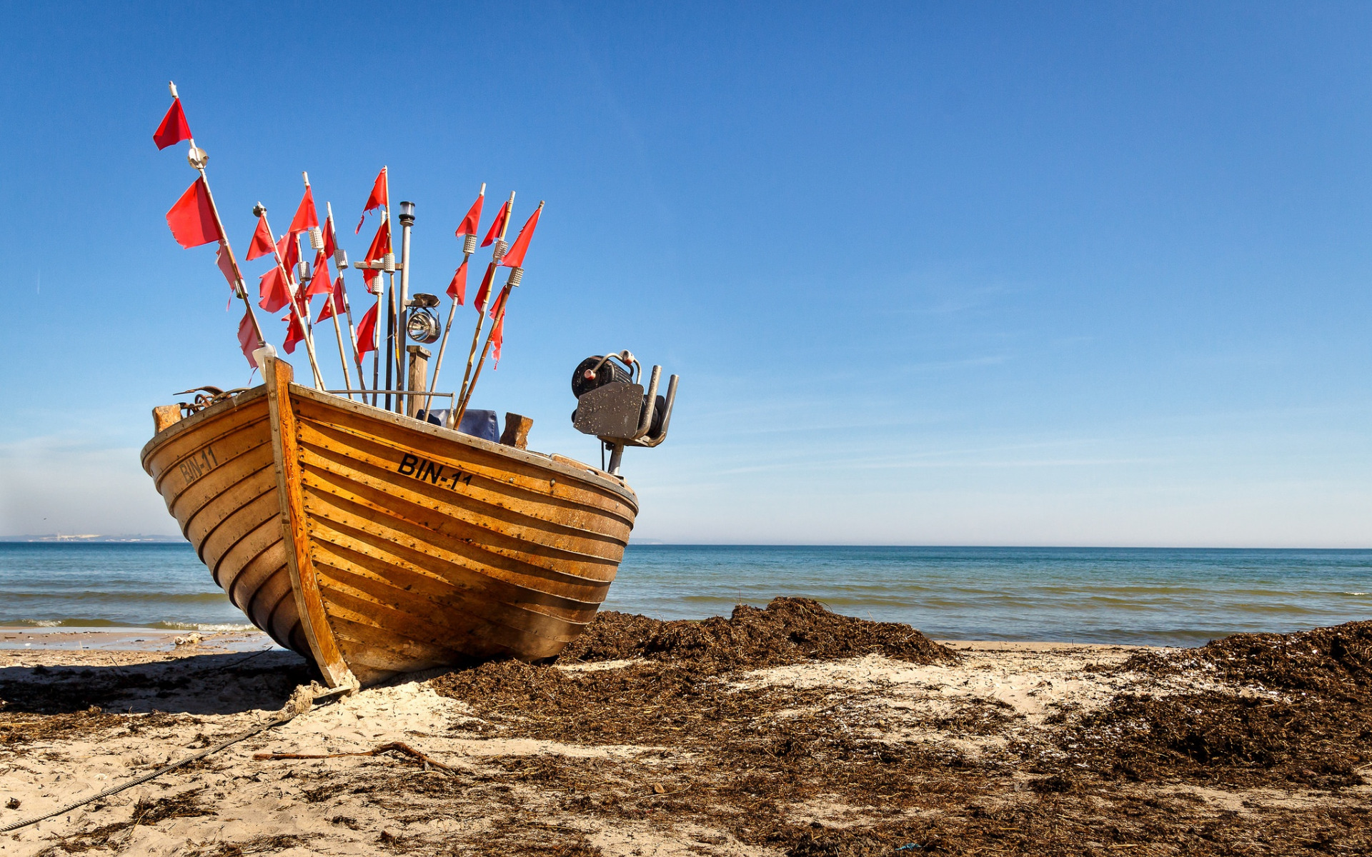 Description: A boat with many flags on it sitting on the beach near the ocean with a blue sky in the background.