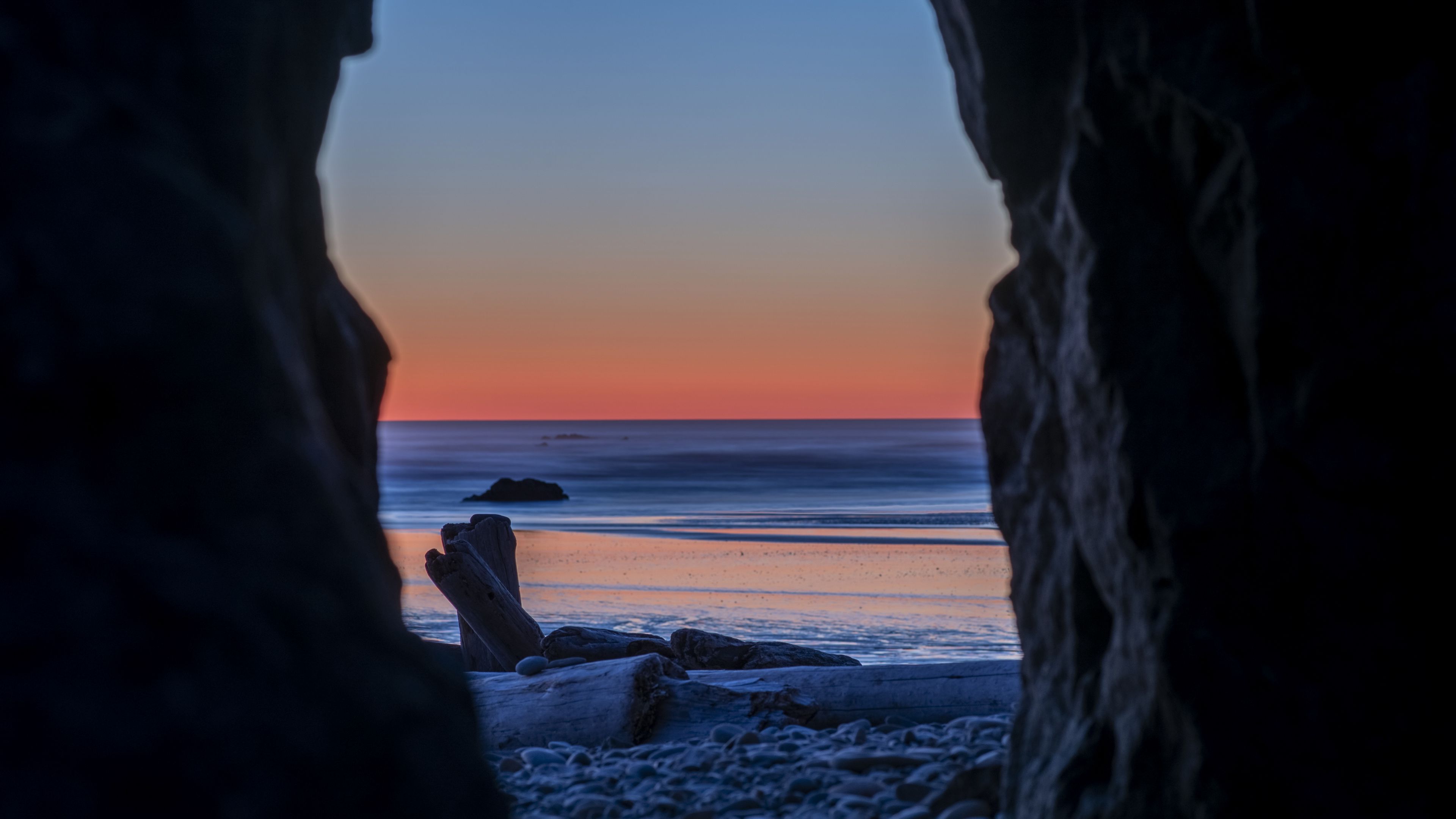 Description: A view of a beach through a cave at sunset or dawn with a view of the ocean and a distant boat.
