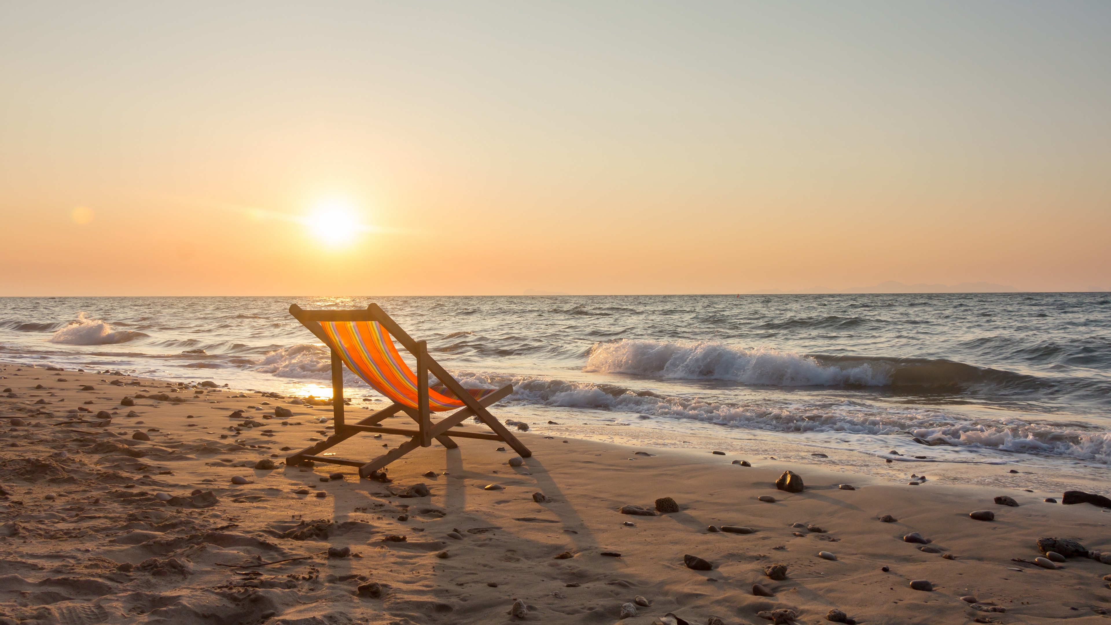 Description: A beach chair sitting on the sand near the ocean at sunset or sunrise time.