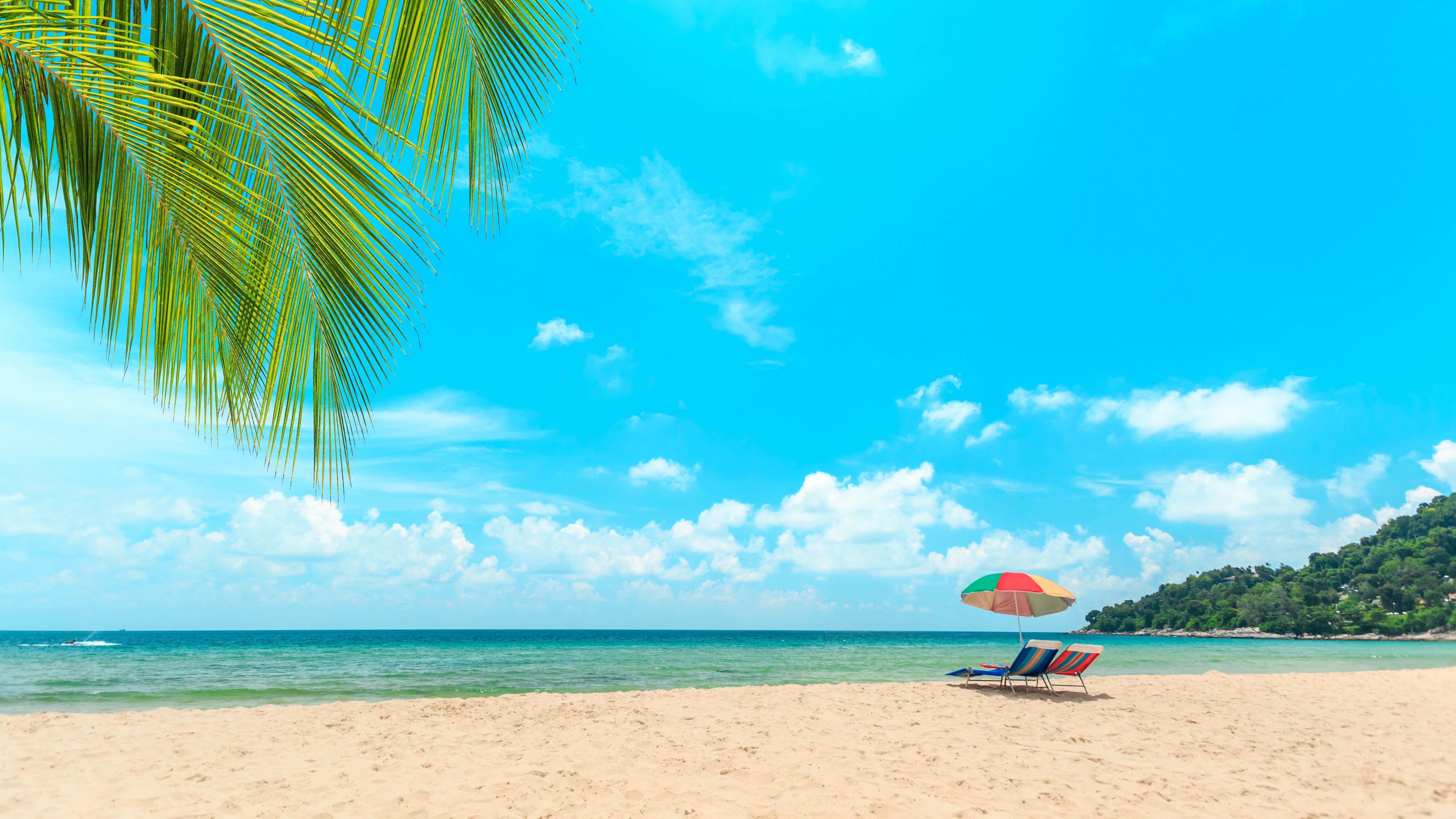 Description: A beach with a chair and umbrella on it and a palm tree in the foreground and a blue sky with clouds.
