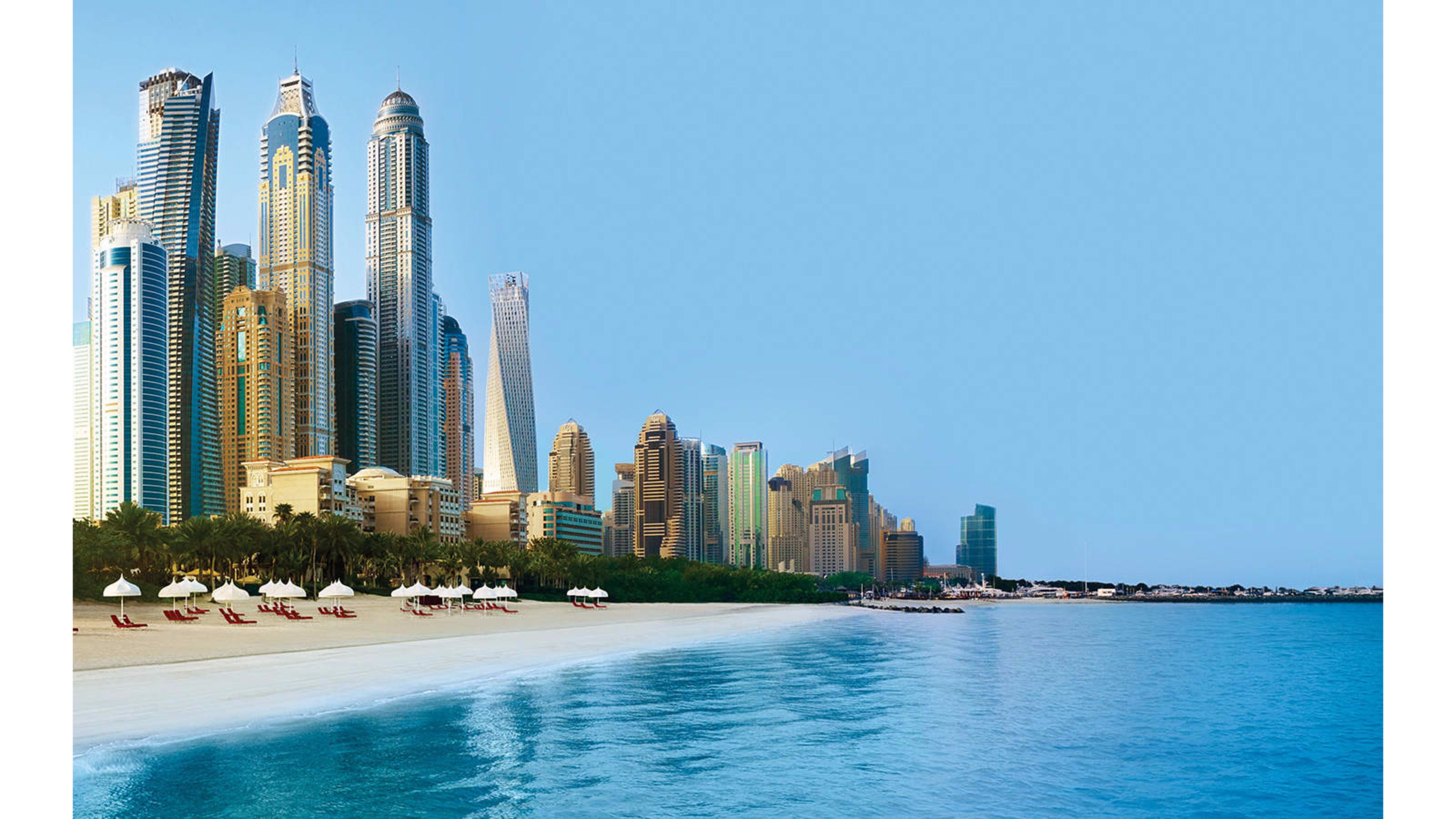 Description: A beach with a lot of chairs and umbrellas in the sand and a city in the background with buildings.