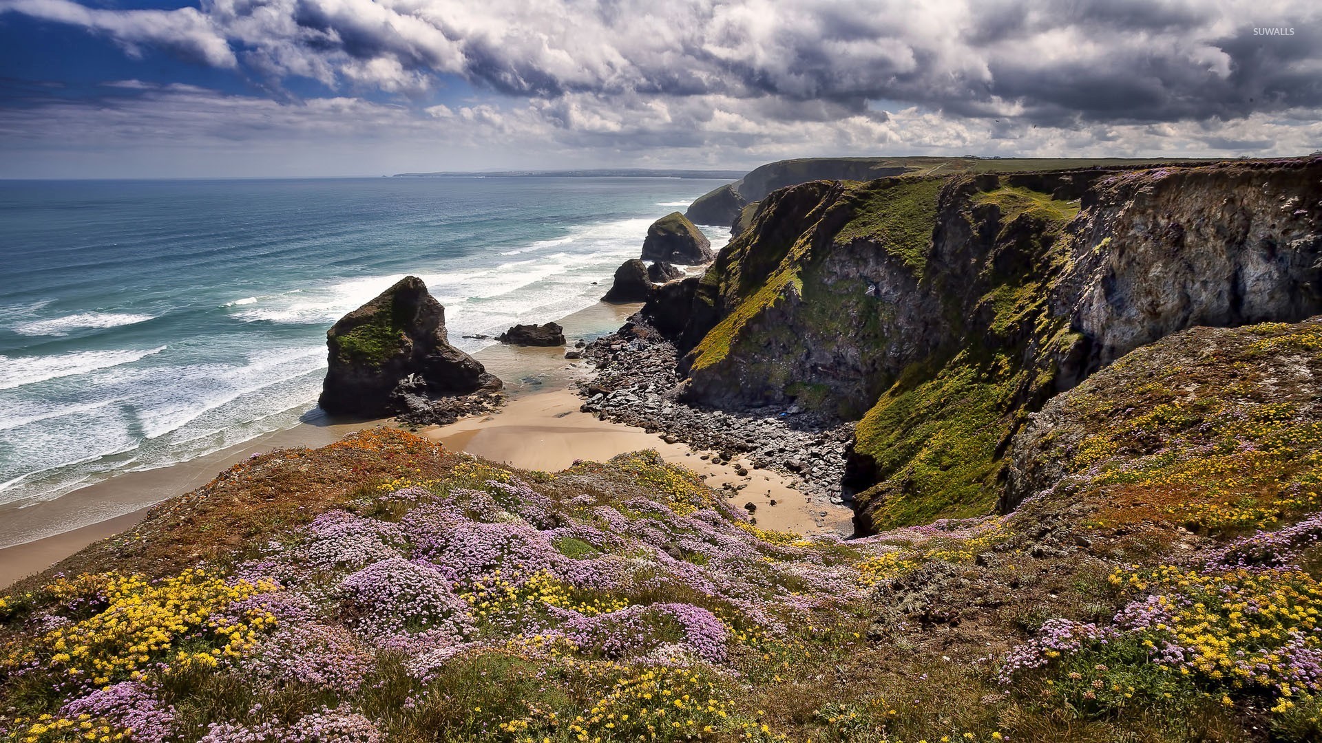 Description: A beach with a cliff and a body of water with a few clouds above it and a few flowers growing on the shore.