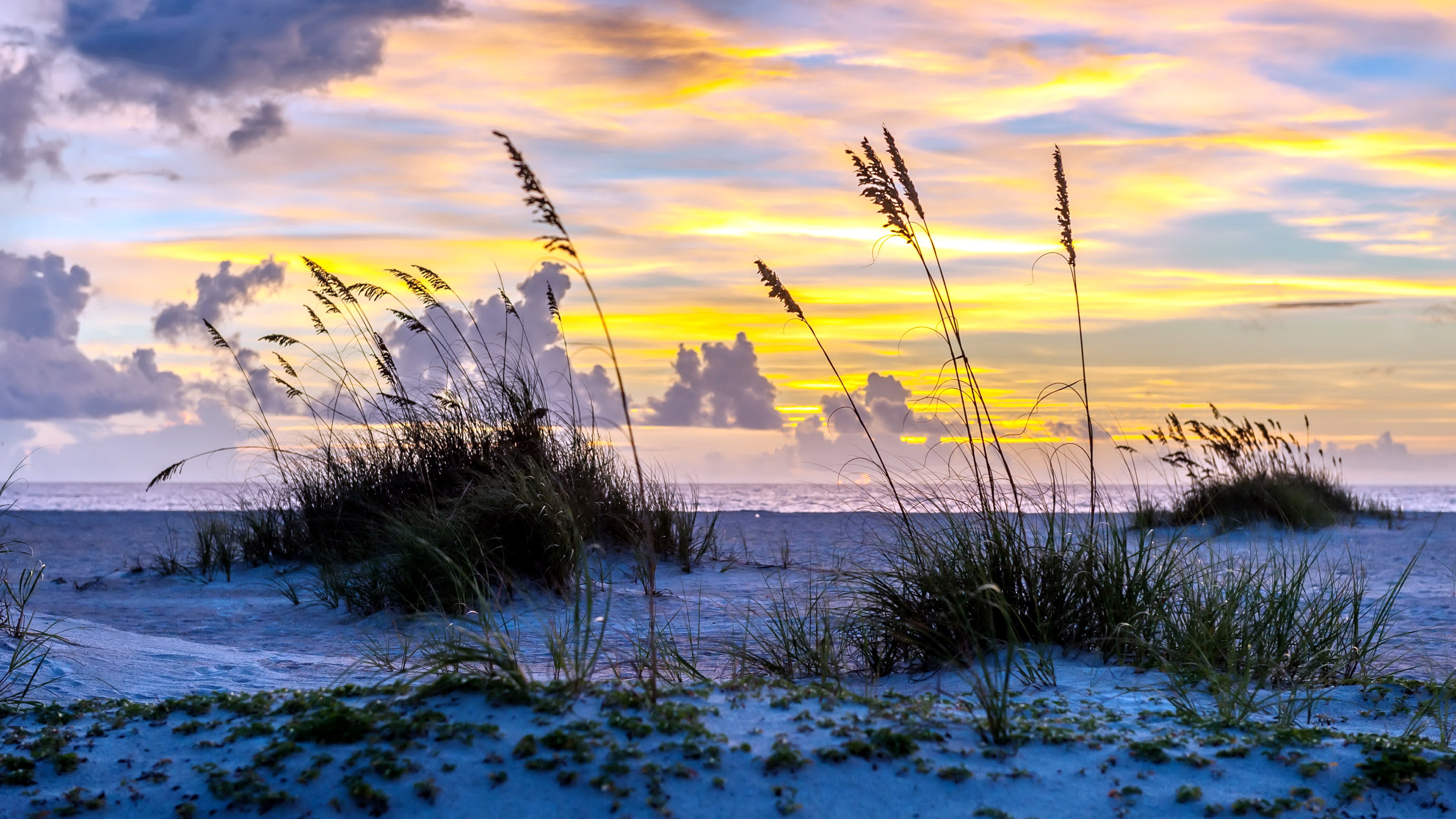 Description: A beach with grass and a sunset in the background with clouds in the sky and a few clouds in the sky.