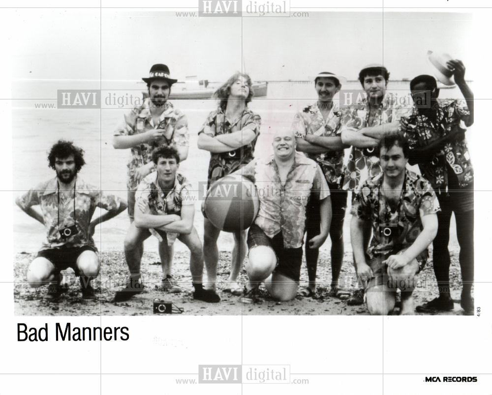 Description: A group of people posing for a picture together on the beach with a boat in the background and a caption that reads bad manns.