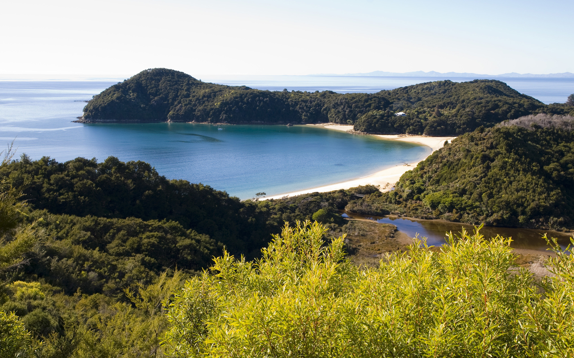 Description: A view of a beach and a body of water from a hill top with trees on the side of it.