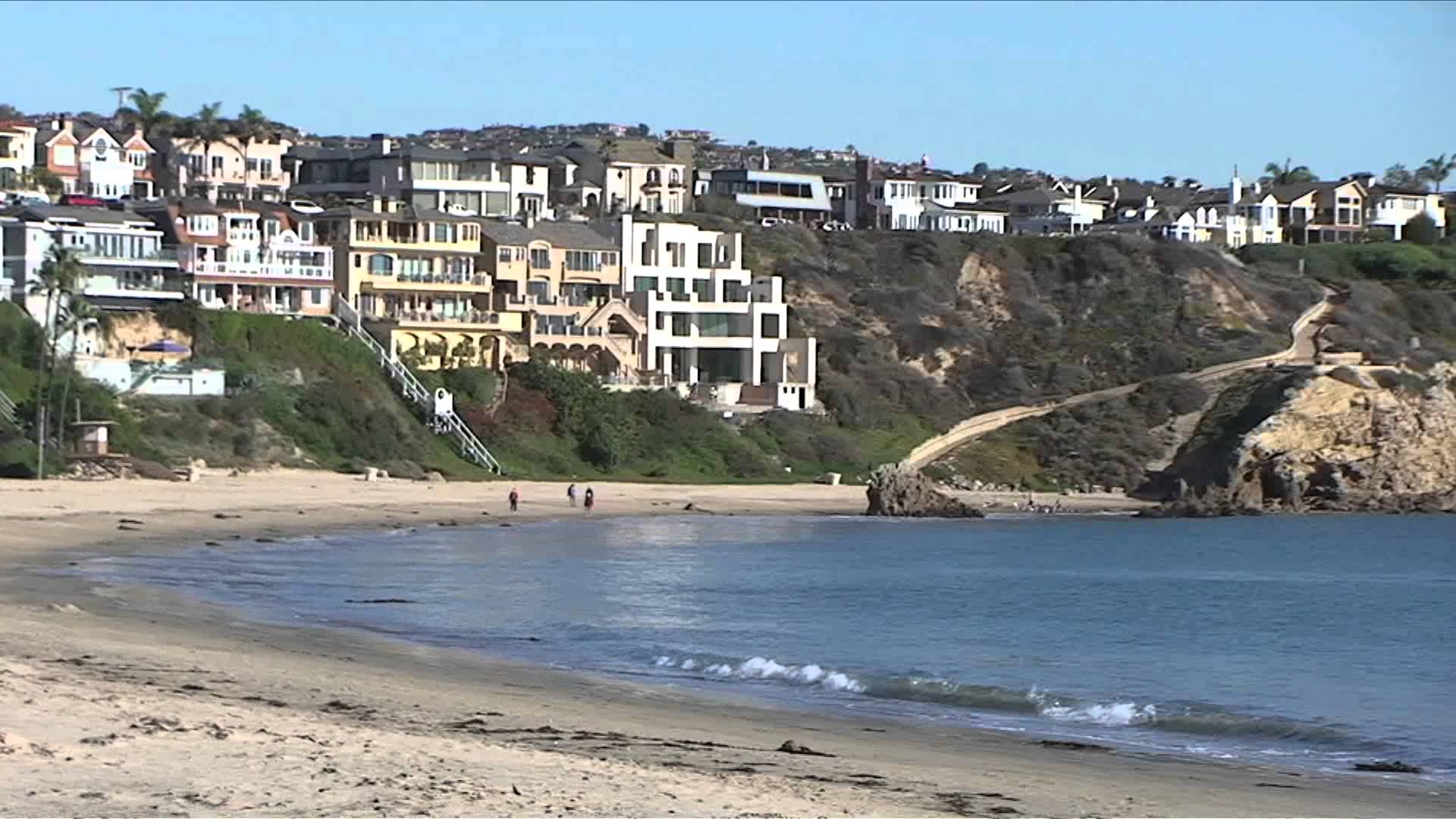 Description: A beach with a bunch of houses on the hill above it and a body of water in front of it.