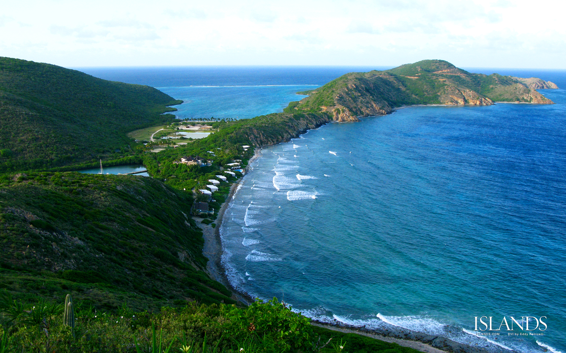 Description: A view of a beach and a mountain side with a body of water and a small island in the middle.