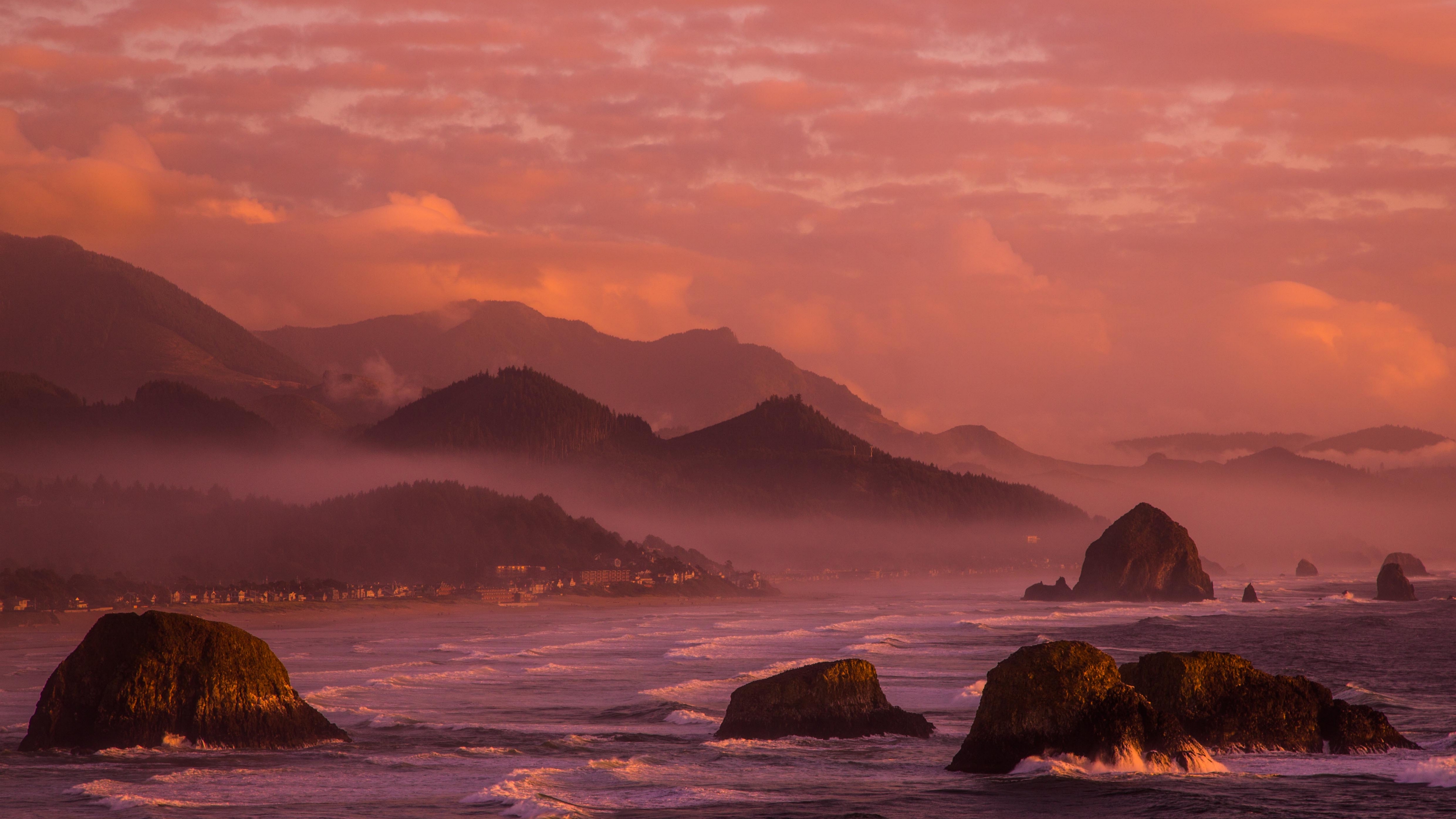 Description: A view of a beach with mountains in the background and a pink sky with clouds in the distance with a few waves.