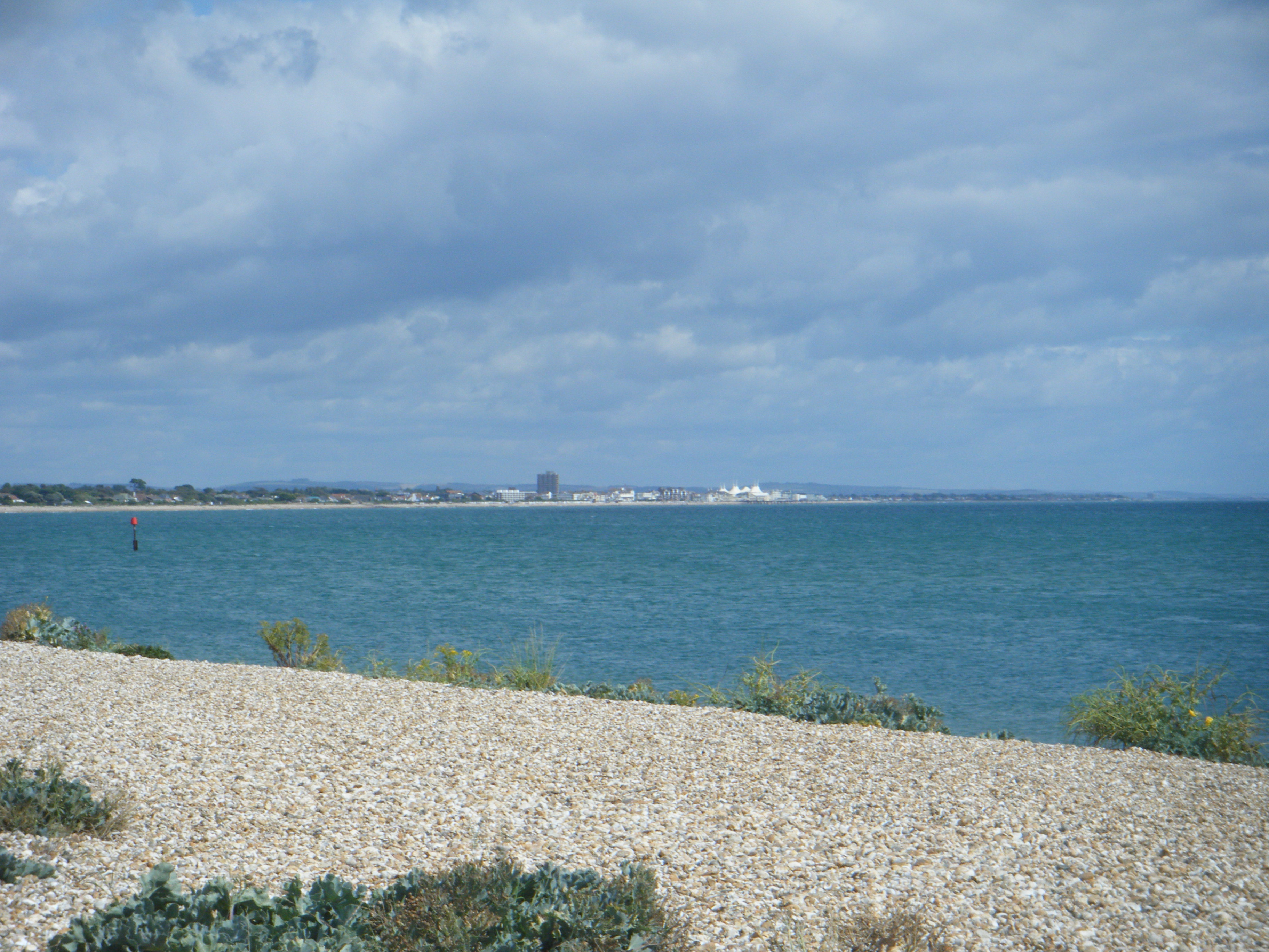 Description: A person is standing on a beach near the ocean and a body of water with a city in the distance.