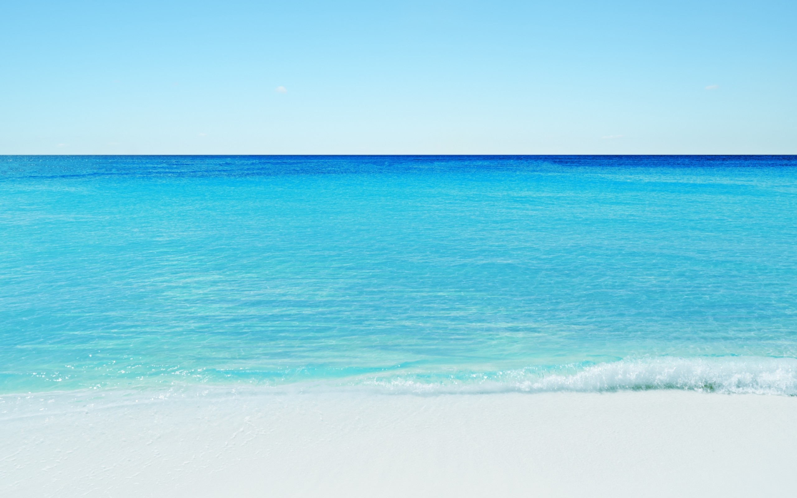 Description: A beach with a blue ocean and a clear sky above it and a white sand beach with a wave coming in.