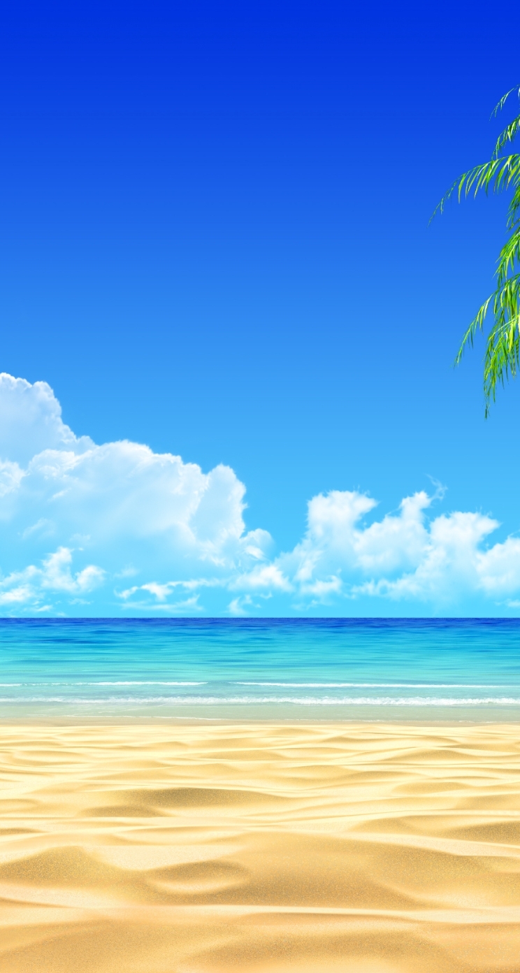 Description: A beach with a palm tree and a blue sky with clouds in the background and a blue sky with clouds.