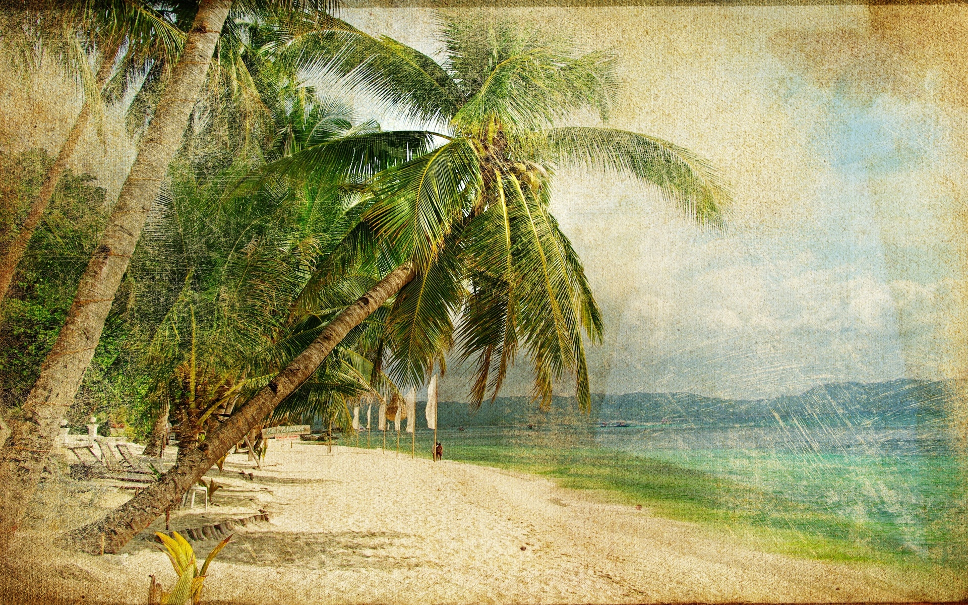 Description: A painting of a beach with a palm tree and a blue sky in the background with clouds in the sky.