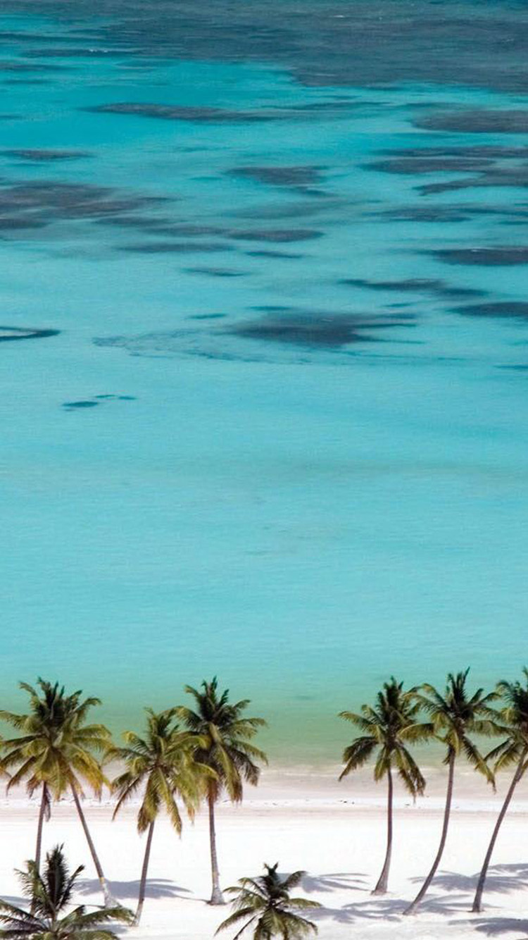 Description: A beach with a few palm trees and a blue ocean in the background with a boat in the water.