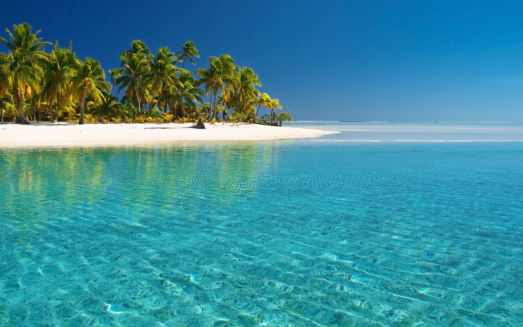 Description: A beach with palm trees and clear water in the ocean with a white sand beach and blue sky in the background.