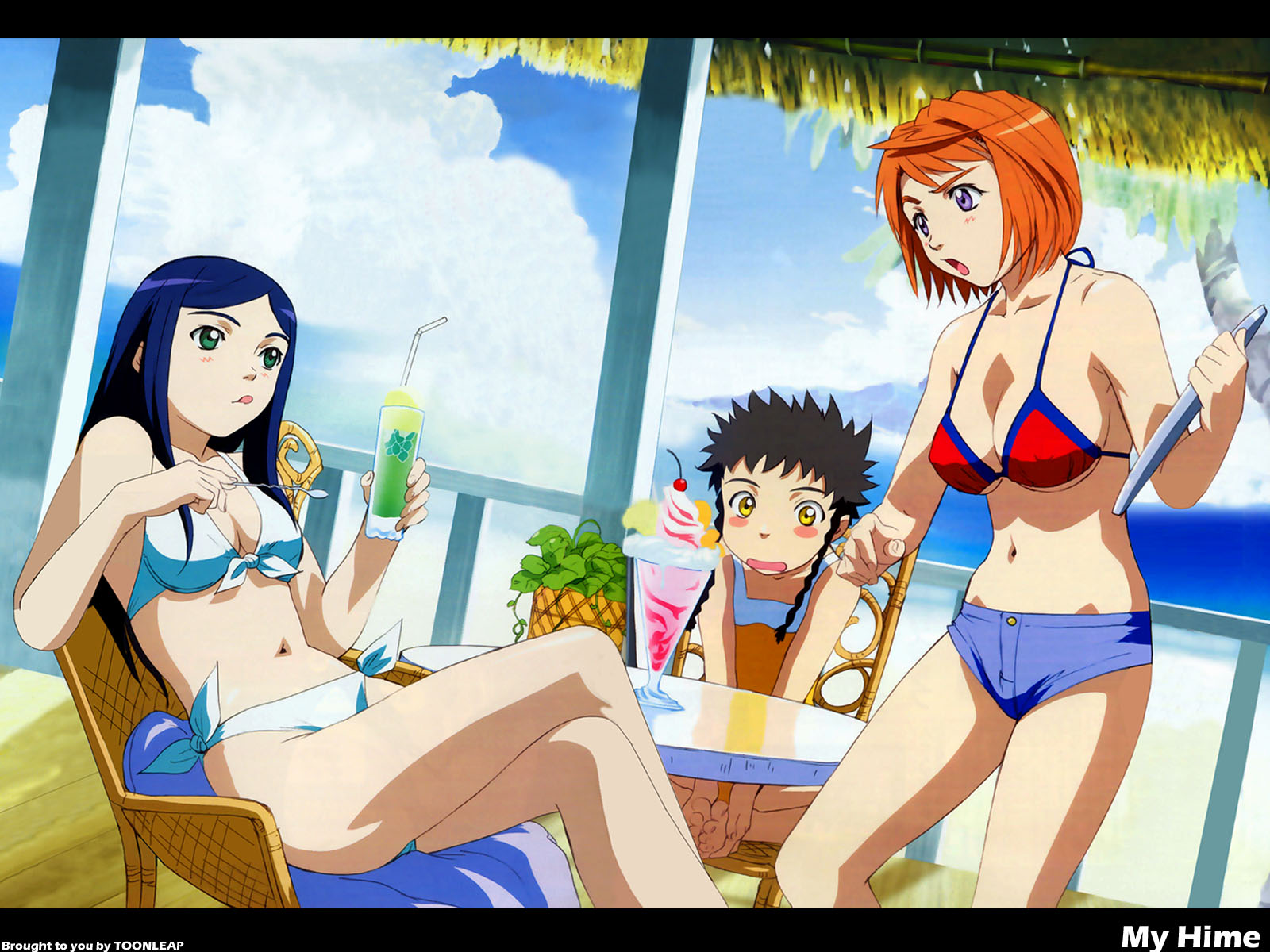 Description: A group of women sitting around a table with drinks in hand and a man standing next to them in a bikini.